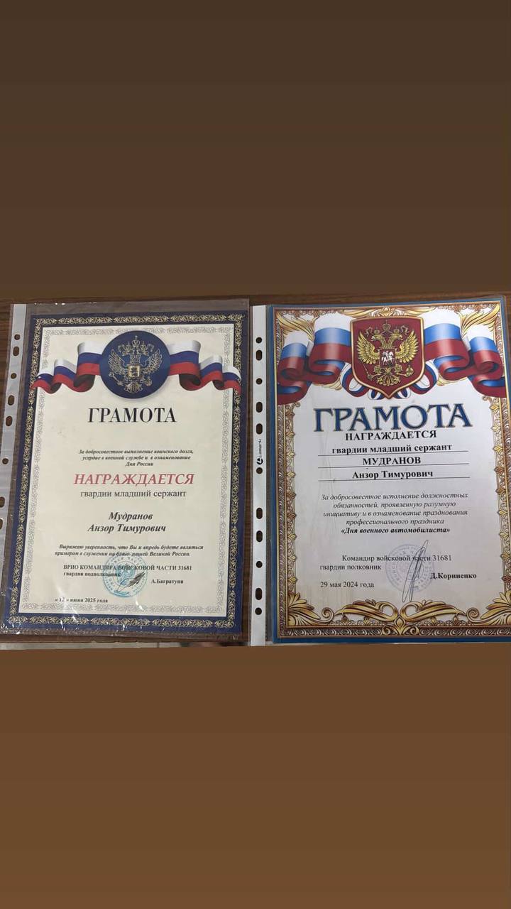 Житель селения Сармаково Анзор Тимурович Мудранов (окончил МКОУ СОШ 2 им. Г. А. Лигидова с. п. Сармактво) с 2022 года проходит службу в зоне СВО. За это время он неоднократно проявлял стойкость, инициативу и высокий профессионализм, выполняя задачи любой сложности. За боевые заслуги он удостоен ряда наград: 🏅 Боевые награды: 📄 Поощрения: Сослуживцы и земляки отмечают его выдержку и преданность делу. Анзор Мудранов служит примером для молодых военнослужащих и всех, кто знает его путь.