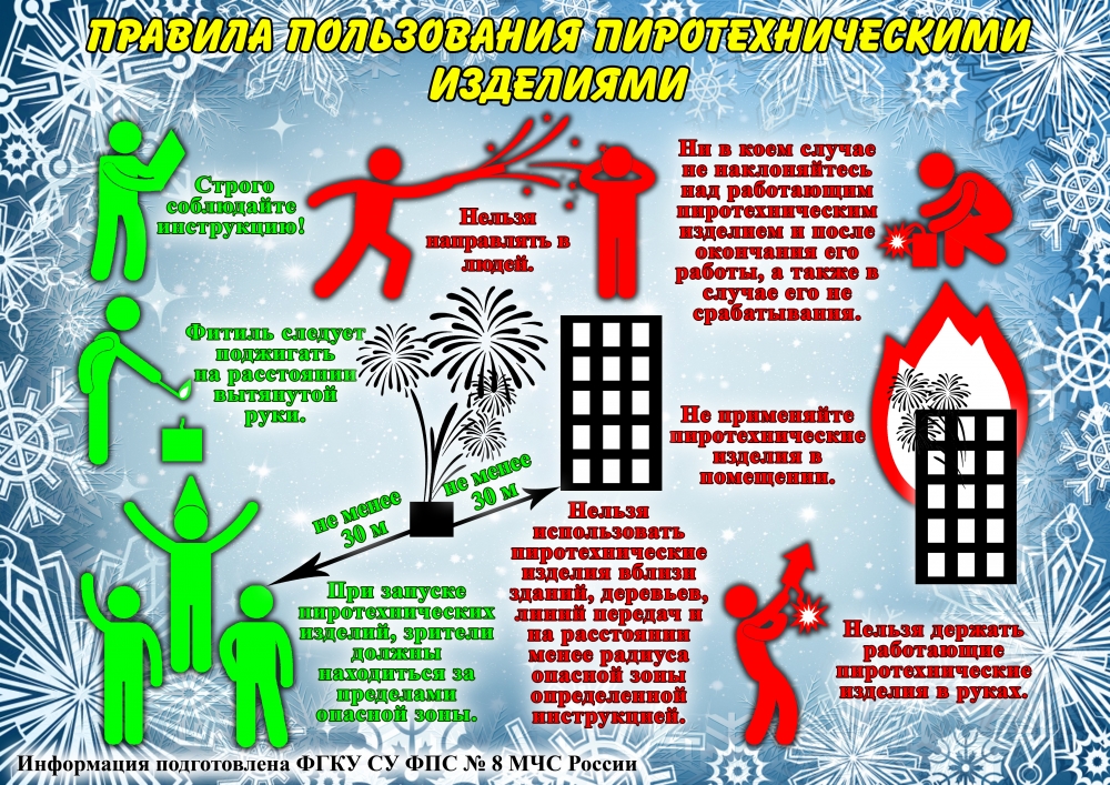 МЕРЫ БЕЗОПАСНОСТИ ПРИ ОБРАЩЕНИИ С ПИРОТЕХНИЧЕСКОЙ ТЕХНИКОЙ Новогодние и Рождественские праздники традиционно сопровождаются фейерверками и салютами. Но в эйфории праздника не стоит забывать о своей безопасности и безопасности людей, окружающих вас. Бесконтрольная реализация пиротехнической продукции и применение ее без соблюдения необходимых мер пожарной безопасности становятся причинами многих пожаров, травм и даже гибели людей, главным образом, детей и подростков. Пиротехника это собирательное название огненных игрушек: фейерверков, петард, хлопушек. На рынке в основном представлена пиротехника бытовая. Самая простейшая — петарды. Они самые дешевые и самые простые в «эксплуатации». Но это не значит, что зажигая их можно совсем забыть о безопасности. Потом идут фейерверки. Они бывают самые разные — летающие, скользящие по земле, взрывающиеся. Следующий класс — ракеты. Какое несчастье может произойти при использовании различных видов пиротехники? В первую очередь - это ожоги. При термических ожогах необходимо обратиться к взрослому за помощью. Но если вы одни, то должны знать следующее: 1. При любой степени ожога желательно охладить тело холодной водой. 7. При химических ожогах глаз - надо срочно и длительно (до 30 минут) промыть водой. Правильное обращение с пиротехникой! Итак, ребята, еще раз напоминаем правила безопасности обращения с пиротехникой. Категорически запрещается применять самодельные пиротехнические устройства. Запрещено: